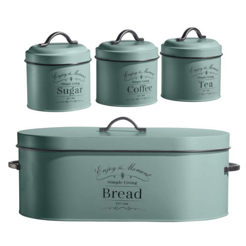 De Herzberg HG-04425: 4-delige Vintage Broodtrommel en Blikset combineert tijdloze Sage Green elegantie met robuuste stalen constructie, waardoor gebakken goederen langer vers blijven en de organisatie van de keuken wordt verbeterd met zijn charmante vintage design. Met een ruime broodtrommel en luchtdichte blikken voor koffie, thee en suiker, zorgt deze duurzame set voor zowel bruikbaarheid als stijl, waardoor het een perfecte aanvulling is op elke keuken of een attent cadeau voor vintageliefhebbers.